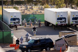 The Mobile Army Surgical Hospital (MASH) refers to a United States Army medical unit serving as a fully functional hospital in a combat area of operations. We are at war with a bug and no leadership except lies, corruption and, distortions and more acolyte lies from the WhiteHouse asshole gallery. So many bodies, many states rely on refrigerated trailer units and convicted ( volunteer good records) prisoners doing the more hands on placement work. SIDEBAR: BOTTOM LINE - MORE PEOPLE WILL DIE