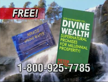In the mid-2000s, Popoff began to offer "Miracle Spring Water" on late-night infomercials in the US, Canada, the UK, Australia, and New Zealand. Respondents are promised miraculous protection from disease and disability, along with financial prosperity (which may include "divine money transfers directly into your account"), if they sleep with the water for one night before drinking it, then pray over the empty packet and send it back to Popoff—with a donation. Multiple solicitation letters follow, requesting more donations in exchange for miracles.