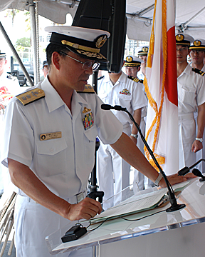 Rear Admiral Takanobu Sasaki (above at podium) commands the Training Squadron. He and other senior officers will make courtesy calls on military and elected officials at Tampa and other cities on the tour, attend friendship events and visit to pay respects at several Memorials. On Wednesday a group attended a Devil Ray's Game. (They won, maybe the second greatest thing that happened)