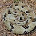 This is a very small rattlesnake averaging 15 to 22 inches long. Their rattle is so small it sounds like an insect buzzing. They are gray with colored blotches running down the back. Its bite is painful but typically not fatal. This snake is responsible for more snake bites in Florida than any other venomous snake. Children should definitely be educated about this animal; because of its small size, a child (or event adult) may believe this to be a “harmless" snake.