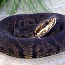 Also called the water moccasin, it is a venomous water snake. Their body coloration ranges from patterned to simply a dull black. You can identify this species by the black "eye line" that runs from the side of their eye back down the side of their head. Juvenile cottonmouths have a different coloration than adults do, but will still have this "eye line". Water Moccasins all have poisonous bites that require immediate medical attention.
