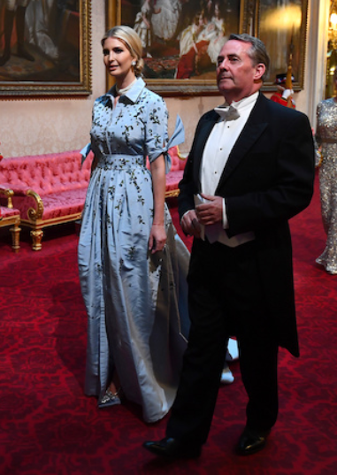 The banquet was another chance for the first lady to showcase a British or American designer, something Ivanka T-RUMP did that evening, wearing a voluminous baby blue shirt-dress gown with embellishments by designer Carolina Herrera. It retails for $11,000.