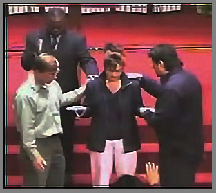 Her church, the third one she belongs to, after being asked to leave the last two, in a town of 8,000 are thinkers, actors, and participants in some strange acts on occasion much like the Taliban who put religion ahead of state. She is Pentecostal though they don’t claim her. This cellphone shot shows her faith is being scrutinized after YouTube videos show her practicing an assertive brand of Pentecostalism called “spiritual warfare.” By Dr Muthree, another clown whose last ritual was destroying and elderly woman in Wasilla.