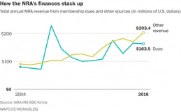 Membership revenue seems to spike following mass shootings and the resultant national discussions about gun control and gun rights. For instance, that 2007 peak came in the year that a gunman murdered 32 people on the campus of Virginia Tech.