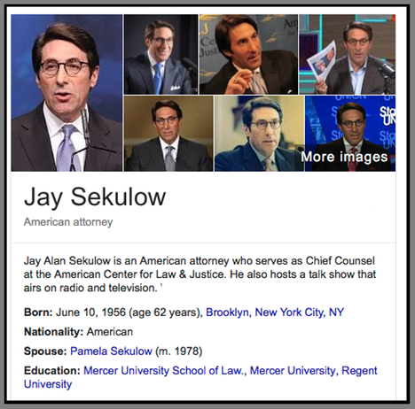 Is an American attorney who serves as Chief Counsel at the American Center for Law & Justice (ACLJ). He also hosts a talk show that airs on radio and television. Sekulow is a frequent guest commentator on the Christian Broadcasting Network and the Fox News Channel. thats because he made no money as a JEW, I think they saw through him…