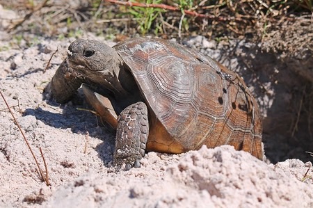 The gopher tortoise is a protected species that occurs in all 67 Florida counties. The tortoise is known as a keystone species, and its burrows serve as important refuges for 350 native species including threatened species such as the Eastern indigo snake, the burrowing owl and the gopher frog. For more information about gopher tortoises, visit MyFWC.com/GopherTortoise.