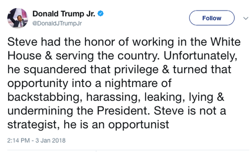 Trump’s personal attorney Charles J. Harder of the firm Harder Mirell & Abrams LLP sent the cease and desist letter Wednesday night after excerpts from Wolff’s book Fire and Fury: Inside the Trump White House surfaced, in which Bannon made derisive comments about Trump’s cognitive abilities and alleged that Donald Trump Jr. set up a Trump Tower meeting with a Russian attorney, which Bannon calls “treasonous.”