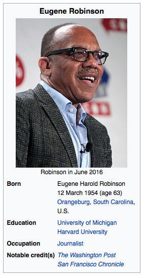 Eugene Harold Robinson (born March 12, 1954) is a liberal American newspaper columnist and an associate editor of The Washington Post. His columns are syndicated to 262 newspapers by The Washington Post Writers Group.