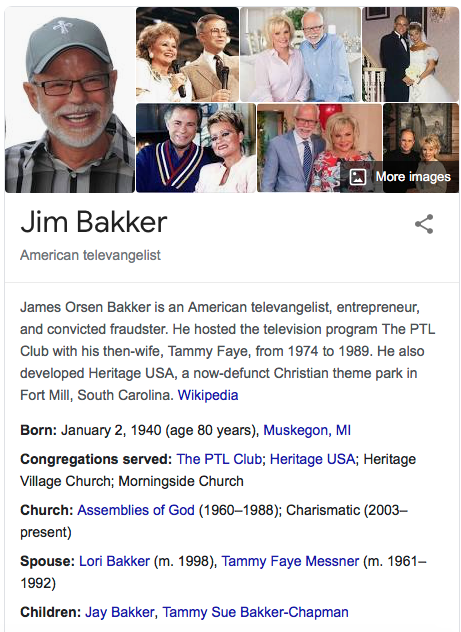 You know them from their fall from grace as the Jim and the late Tammy Bakker, the Popoff's, and the Swaggarts, lots of begetting there. One of the most tragic stories is that of Jim Bakker a former restaurant helper turned evangelist and his wife Tammy Fay Bakker who died at 62 from a long bout with cancer.