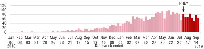 There were 64 hepatitis A cases reported last week. Case counts in weeks prior to the public health emergency declaration are shown in light red while case counts in weeks since are shown in red.
