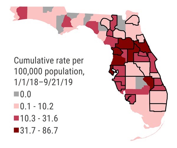 Counties that reported a hepatitis A case last week are outlined in black. Since January 1, 2018, 98% of cases have likely been acquired locally in Florida.