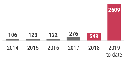 The number of reported hepatitis A cases more than doubled from 2016 to 2017 and nearly doubled again in 2018 after remaining relatively stable in previous years. Case counts in 2019 have already surpassed those in 2018.