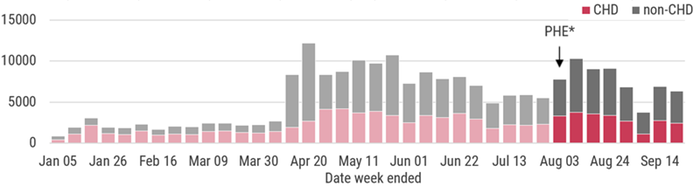 From September 15, 2019 to September 21, 2019, county health departments (CHDs) administered 2,455 (39%) of the total 6,361 first doses of hepatitis A vaccine administered to adults age 18 years and older, as recorded in Florida SHOTS. In 2019 CHDs have administered 88,596 vaccinations and non-CHDs have administered 130,628 vaccinations for a total of 219,224 vaccinations. Vaccinations given before the public health emergency declaration are shown in lighter colors than those given after.