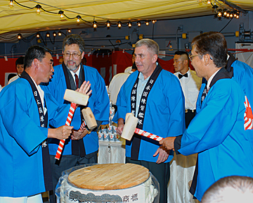 The hors d'oeuvres were incredible and the friendship was consummated by the ritualistic opening of the SAKI drum. It looked like about twelve gallons of prime Japanese saki and it was very, very...incredibly delicious.
