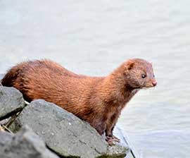 Moving with ease between land and water, the American mink usually chooses to live in woodsy areas near streams, ponds, or lakes, creating its burrow in the banks of a river, stream, or lake, or sometimes appropriating an abandoned den of a muskrat. Their ideal habitat also includes brushy cover or rocky crevices.