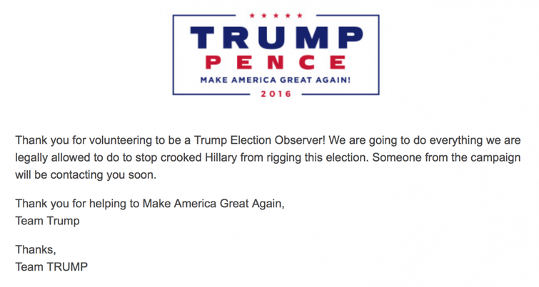 After telling an audience in Altoona, Pa., that he would seek their help in policing the polls in November to root out voter fraud Donald Trump’s campaign nationalized the effort on Saturday morning. NOTE : There is no voter fraud, just another scam. Now eager Trump backers can go to Trump’s website and sign up to be “ Trump Election Observer.” Do so, and you get an email thanking you for volunteering and assuring you that the campaign will "do everything we are legally allowed to do to stop crooked Hillary from rigging this election."