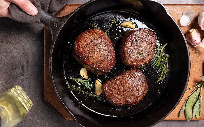 3. Add high-temp oil and place steaks in pan — Once your skillet is fully pre-heated, add a high-temp oil. Grape seed oil, canola oil, ghee, duck or pork fat are great choices. To ensure a great sear and a perfect cook for your steak, the skillet needs to be HOT. The oil should sizzle when placed in the pan. If it doesn’t, your skillet isn’t hot enough. Once sufficiently hot, place steaks in pan.