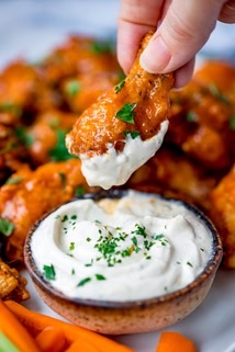 You’ll often find buffalo wings served with a creamy blue cheese sauce for dipping, along with carrot and celery sticks for cleansing the palate and adding a bit of pleasing crunch to the dish.