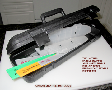 I had a slew of blade protectors and was waltzing through the mall at Sears one day when I saw this inexpensive long and narrow tool box holder thingy in the tools department and it was cheap at nine dollars. Complete with two latches and a handle.
