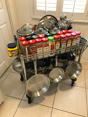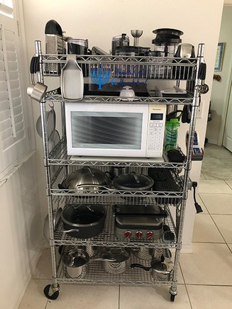 - The Rack — A Rolling Rack NSF also found at SAM’s made this part simple. NSF carts made of chrome shelving and modified to what I needed. All on rollers so that I can slide them out of the kitchen for steam mop cleanliness.