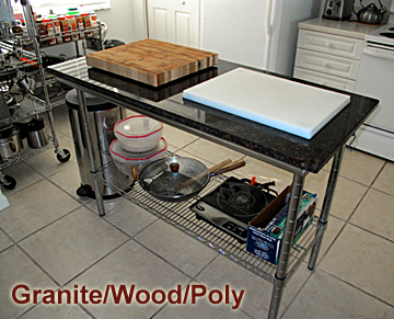 - The other surfaces, countertops are all Corian so thats OK, but I wanted something I can "dough on". I took this table, courtesy of Sam's Club, an NSF prep table, and found a vendor with small ends of Granite remnants.