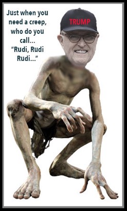 Sidebar: Hot News This Week — After extensive search of the sewers and garbage dumps, the Kings “ personal” attorney and fraud leader “ Herr Rudy the Oberstupenführer " surfaced. What a joke he is… Rudy the man who claims he saved NY, and then did nothing…and is now something from a Hobbit movie the Golem…Good News… the Village Idiot surfaced in two places this week. The bad news is he is still alive. Even Donald grimaced at his two incredible screw-ups. Rudy Gholi-ami is unfortunately alive, at least for now doing more harm at Donald’s bequest …