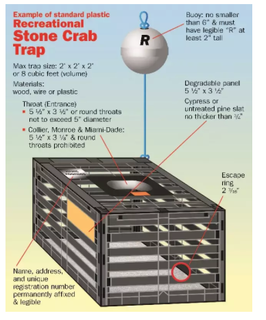 Recreational Trap Registration — As a reminder, all plastic and wood stone crab traps will need to be outfitted with a 2 3/16-inch escape ring before the 2023/2024 season.