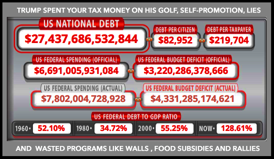Check our Gross National Debt and the possibility your kids will be looking at deficits in the 30-35 trillion dollars numbers in the and seeing a real mess as this situation will take ten to twelve years to rectify… T-RUMP is dominating cash raising as his personal debts range around a billion grabbing what he can now and not caring. It already has a name ‘The T-RUMP DUMP. Too lazy we are at $27,437,000,000 in debt at $3,220,000,000, in interest so far. And th possibility of trillions mor popping up after he leaves