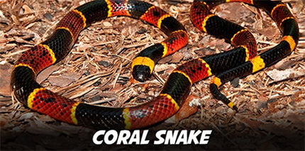 🐍 CORAL SNAKES — Coral snakes (poisonous) which look like a King-snake which is a great rat catcher. Nature colors the King-snake and friends similar as a protective warning to birds and other predators. There is also the Scarlet and the King Scarlet. There are many varieties of coral snakes throughout the Americas, but we will address the southern USA snakes. The most common species in the United States have a universal red-yellow-black-yellow pattern.