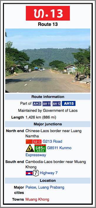In LAOS today Route 13, is the most important highway in the country of Laos. Since it is the only major road. It begins at Boten in the North of Laos at the Chinese border. It connects the city of Vientiane to Luang Prabang in the North and roughly follows the line of the Mekong River down to the border with Cambodia. Route 13 passes through the cities of Vientiane, Vang Vieng and Luang Prabang.