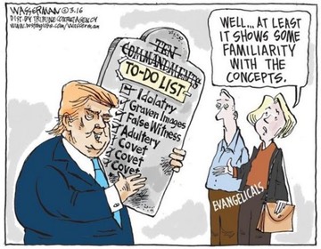 Ordinary Americans probably wouldn’t have even noticed the announcement, but Evangelicals knew that Trump was speaking their language. Many of them believe T-RUMP is like Cyrus, a flawed nonbeliever who nonetheless is chosen by God to work his miracles on Earth. We believe he is more like Hitler and just flawed really biggly.